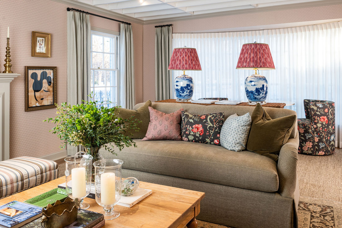This 1950's cape cod formal living room needed a shift in proportions. We removed the drywall ceiling and exposed the beams underneath. After paining them white, expertly adding blocking and crown molding and lighting the room opened up, chilled out and felt more cottagey and casual like we intended. The extra ceiling height and texture went a long way to give this room the feeling intended